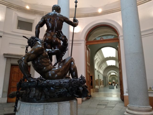 El acceso se realiza por la entrada de Goya donde recibe al visitante la escultura de «Carlos V y el Furor» una escultura desmontable (1551-55) en bronce. La estatua fue encargada en 1549 por Carlos V (1500-1558) al escultor italiano Leone Leoni. el artista hizo fundir la obra en Milán por partes: en 1551 la figura desnuda del emperador y la armadura desmontable, en 1553 el Furoro y en 1555 el pedestal con trofeos y armas. La inscripción latina en la base: «CAESARIS VIRTUTE DOMITUS FUROR», indica que el grupo representa una alegoría política: «Por la virtud del César está dominado el Furor», es decir, el desorden, la rebeldía y el caos.