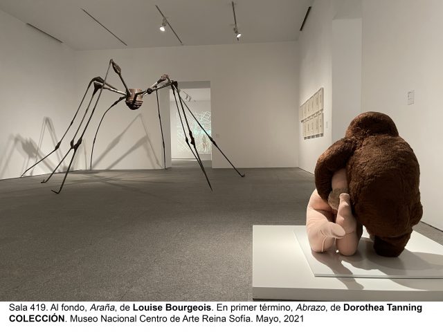 Se expone la imponente Araña de Bourgeois, realizada en 1994 que se relaciona con la idea de la casa y del espacio interior, habitado por la mujer, pero de un modo completamente distinto al paradigma americano de la mujer. De Dorothea Tanning se muestran diferentes piezas incorporadas a la Colección tras la muestra el Museo le dedica en 2018 y que ha permitido construir un relato donde destaca la escultura Abrazo (1969), una pieza de marcado carácter antiformal. En ambas artistas, el espacio interior, la habitación o la casa -aclara Peiró- es reivindicado como espacio mental y onírico en el que construir una nueva identidad más allá de las limitaciones del género. Era de esperar que trabajos tan radicales no fueran totalmente entendidos en una América conservadora y puritana, ni en un medio artístico cuya prevalencia por lo óptico era definitoria.
