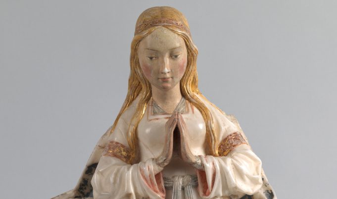 La obra, Virgen orante entronizada, realizada en alabastro policromado y parcialmente dorado, fue adquirida por el Patronato Nacional de Museos en 1971 y catalogada como pieza de escultura medieval perteneciente a la escuela española del siglo XV. Se asignó al Museo Nacional del Prado en 1974.