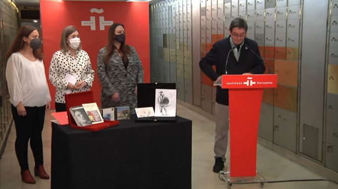 Además de los dos libros de la primera etapa creativa de Hierro, también se guardaron dos dibujos: un autorretrato de su cabeza, “ese cráneo privilegiado e imagen poderosa” que transmitía, dijo Tacha Romero, y una figura de Don Quijote que el poeta hizo en el reverso de un papel del acto en el que recibió el Premio Príncipe de Asturias en 1981.