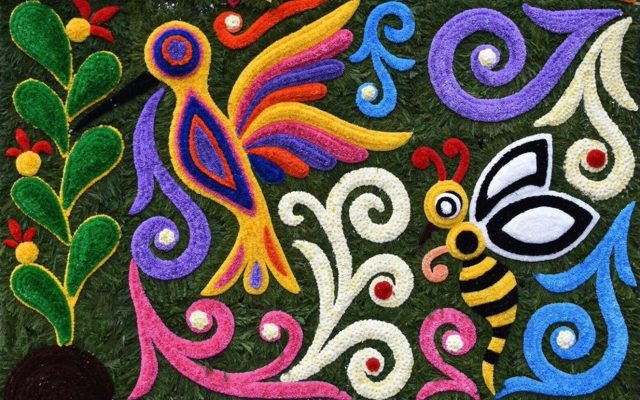 Los tenangos plagados de imágenes de flores y seres fantásticos son un bordado en textil que representa a la primavera, a través de la exuberancia de sus formas, sus múltiples expresiones lúdicas y la energía del color. Realizados ahora con flores, en lugar de hilos, han resultado en una explosión de vitalidad.