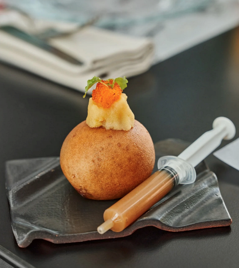 Se trata de una especie de buñuelo de carne de vacuno, con una capa de rebozado crujiente, queso crema y coronado con tobiko (huevas de pez volador) que se acompaña con una pequeña jeringuilla de plástico llena de un jugo concentrado de carne, que hay que inyectar dentro del buñuelo. Hay que comerlo de un bocado porque si no el líquido se escapa. Demasiado complicado, aunque ideal para una velada tranquila… y, además, barato, solo 4,80 euros.