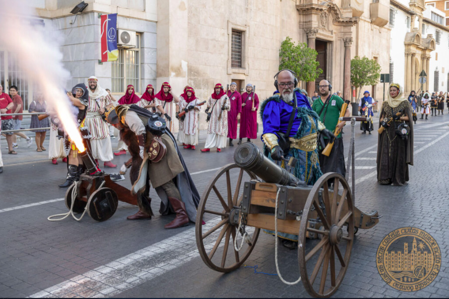Y cada día, al caer la noche, moros y cristianos se juntan, una vez más, en el Campamento Medieval, que este año está situado desde la plaza de la Cruz hasta el Teatro Romea, muy cerca del malecón del Segura, donde cada kábila o mesnada tiene su propio espacio, un lugar de encuentro, diversión y convivencia, con distintas especialidades gastronómicas que compartir hasta la madrugada.