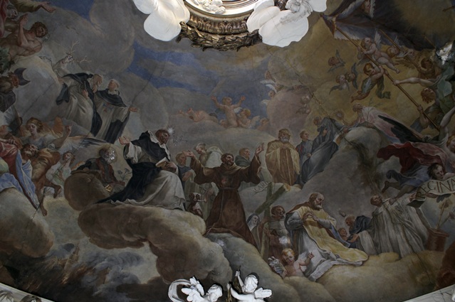 Rodeando a este grupo central, se puede ver a San Romualdo, San Francisco, San Francisco Javier, San Pascual Bailón, Adán y la cabeza de la única mujer, Santa Teresa. Por otra parte, en las cuatro pechinas, Ramón Bayeu representó a la Religión, la Esperanza, la Obediencia, y, por último, la Pobreza.