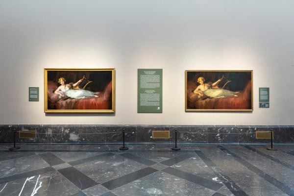 Como parte de la conmemoración de la recuperación del retrato de La marquesa de Santa Cruz, el Museo del Prado ha realizado una instalación especial en la sala 38 del Edificio Villanueva del original junto a una de las copias mencionadas, adquirida y restaurada por el galerista e historiador del arte, José de la Mano.