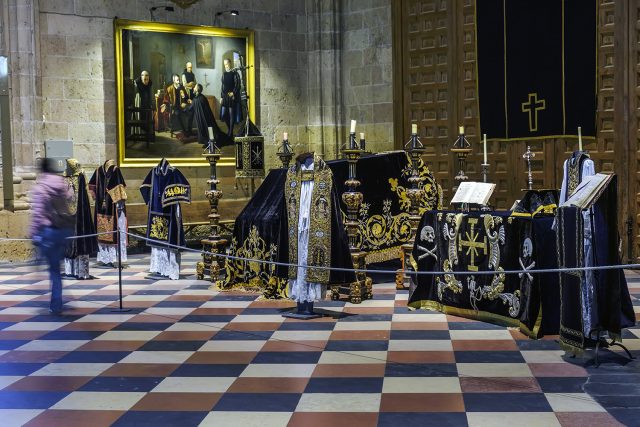 Además del túmulo, el monumento fúnebre se acompaña con una capa pluvial, dos dalmáticas, una manga que simboliza la celebración de Todos los Difuntos y una casulla al lado del Altar donde se ubica.