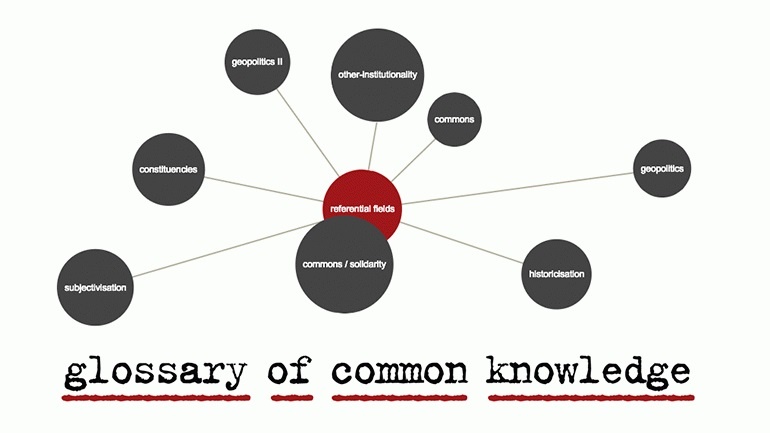 Glossary of Common Knowledge [Glosario del Conocimiento Común] es un proyecto de la confederación europea de museos L’Internationale iniciado en 2014 con un objetivo doble: compilar un glosario sobre arte que posibilite ampliar el vocabulario de la literatura artística, y hacerlo en colaboración con instituciones y personas de Europa y otras partes del mundo. Cada edición se inicia con una conferencia, seguida de varias jornadas de trabajo en las que un grupo de participantes invitad+s proponen nuevos términos alrededor de un “campo referencial” dado.