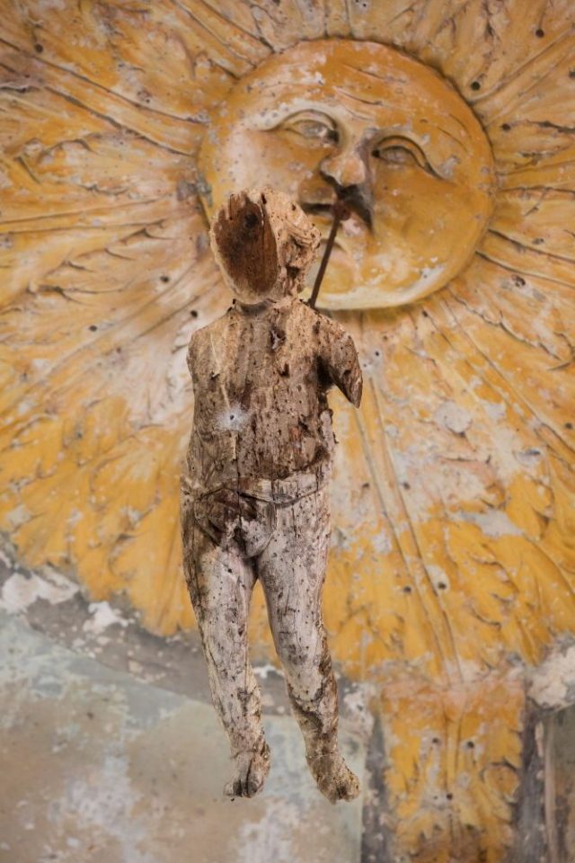 En el interior del edificio destaca la cúpula elíptica de gajos, donde se encuentran los vanos u óculos y que conserva todavía motivos decorativos como el gran sol amarillo que decora la clave, del que salen doce rayos con forma de palma y doce rayos con forma de lanza. Una figura humana tallada en madera cuelga de este punto, sin saber qué significado puede tener.