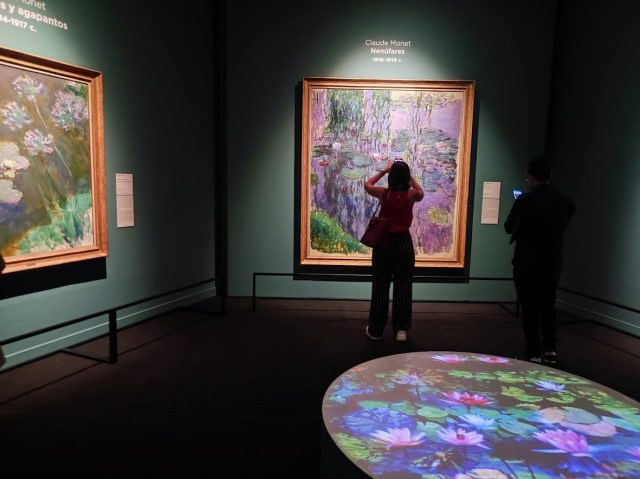 «Mi jardín es una obra lenta, hecho con amor. Y no escondo que me enorgullece» a lo largo del recorrido se pueden leer frases del artista que acompañan a las pinturas de forma coherente «Amo el agua, pero también las flores». Por otra parte, y como cada vez es más habitual, las nuevas tecnologías hacen su aparición en el recorrido en forma de proyección de imágenes de paisajes que unen las secciones temáticas de la exposición, pequeños recorridos donde el espectador se sumerge en el agua y nenúfares.