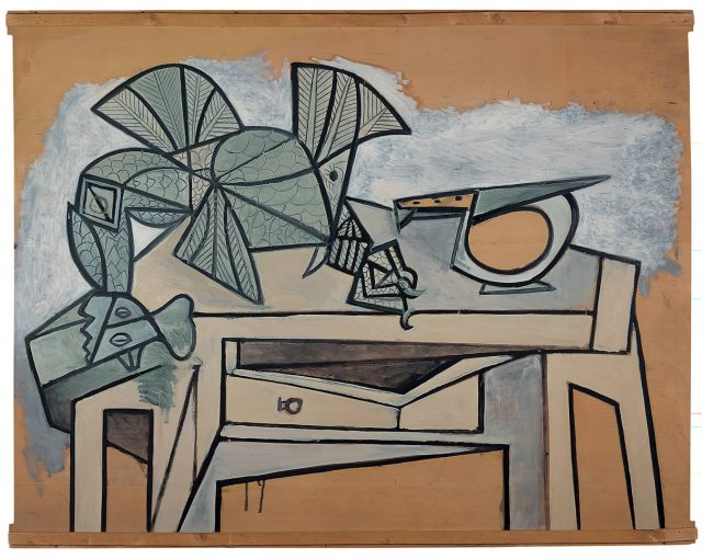 Un gallo sacrificado yace atado de patas sobre una mesa. Tiene enfrente un cuchillo y un cuenco vacío. Los tres objetos que ocupan la mitad superior de la tela reposan como elementos de un sacrificio sobre el altar. Las patas de la mesa y el cajón abierto parecen acercarse y alejarse simultáneamente a la manera cubista. Picasso realiza esta obra en el año 1947, en una Europa convulsionada por años de conflicto. Sigue leyendo más sobre esta obra en el Museo Picasso Málaga